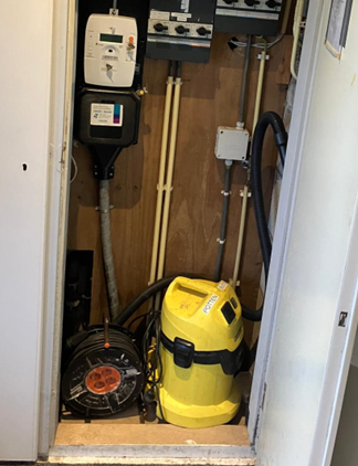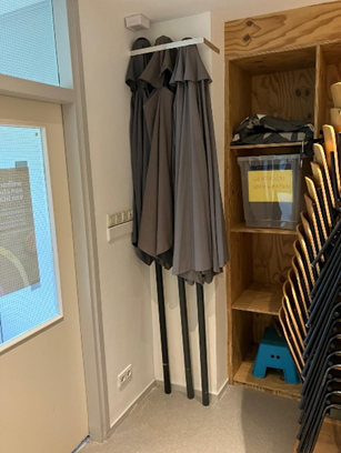 We hebben meteen maar de meterkast opgeruimd. Hierdoor is er nu plek voor de stofzuiger voor de potten in het veld met verlengsnoer. Daarnaast hebben de parasols een vaste plek gekregen in de hal naast de lichtknoppen.