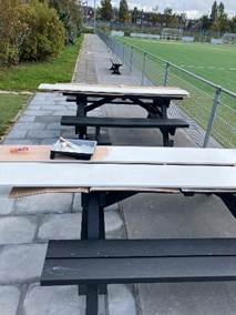 Eind vorig seizoen hebben we de dakrand gerepareerd aan het eind van de kantine. Helaas kwam niet lang daarna de mededeling dat Ronald een lekkage had gezien voor de hoofdingang. De dakgoot is op meerdere plekken lek geraakt en op sommige plekken waarschijnlijk al wat langer, want er is zijn een aantal rotte plekken in de boeidelen en de constructie daarachter. We zijn deze winter daarom begonnen met het zagen en verven van nieuwe boeidelen. Dit gaat als een trein, want sinds kort hebben Arie en ik aanvulling gekregen in het team. Joop, de vader van Chantal, is lekker met pensioen, is graag bezig en vond dat wij wel wat begeleiding konden gebruiken, als het weer en de planning het toelaten gaat de goot eruit en gaan we het hout repareren.