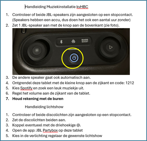 Achterop de tablet zit nu een korte handleiding hoe de JBL boxen te bedienen zijn.